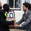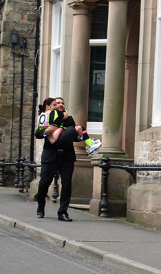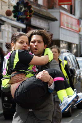 The framework of 0 (Zero) is based on a relay race. In this race, however, only one team takes part, rendering a competitive sport entirely non-competitive. a team of three physically fit, able-bodied men, wearing smart business attire, run the race using the artist's disabled, female body, dressed in sports gear, as a human baton, passing it between each other after completion of each lap.